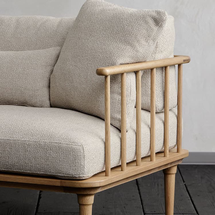 格子状のフレームと様々なクッションの組み合わせが目を惹くフーバ3人掛けソファ両肘で木脚です。