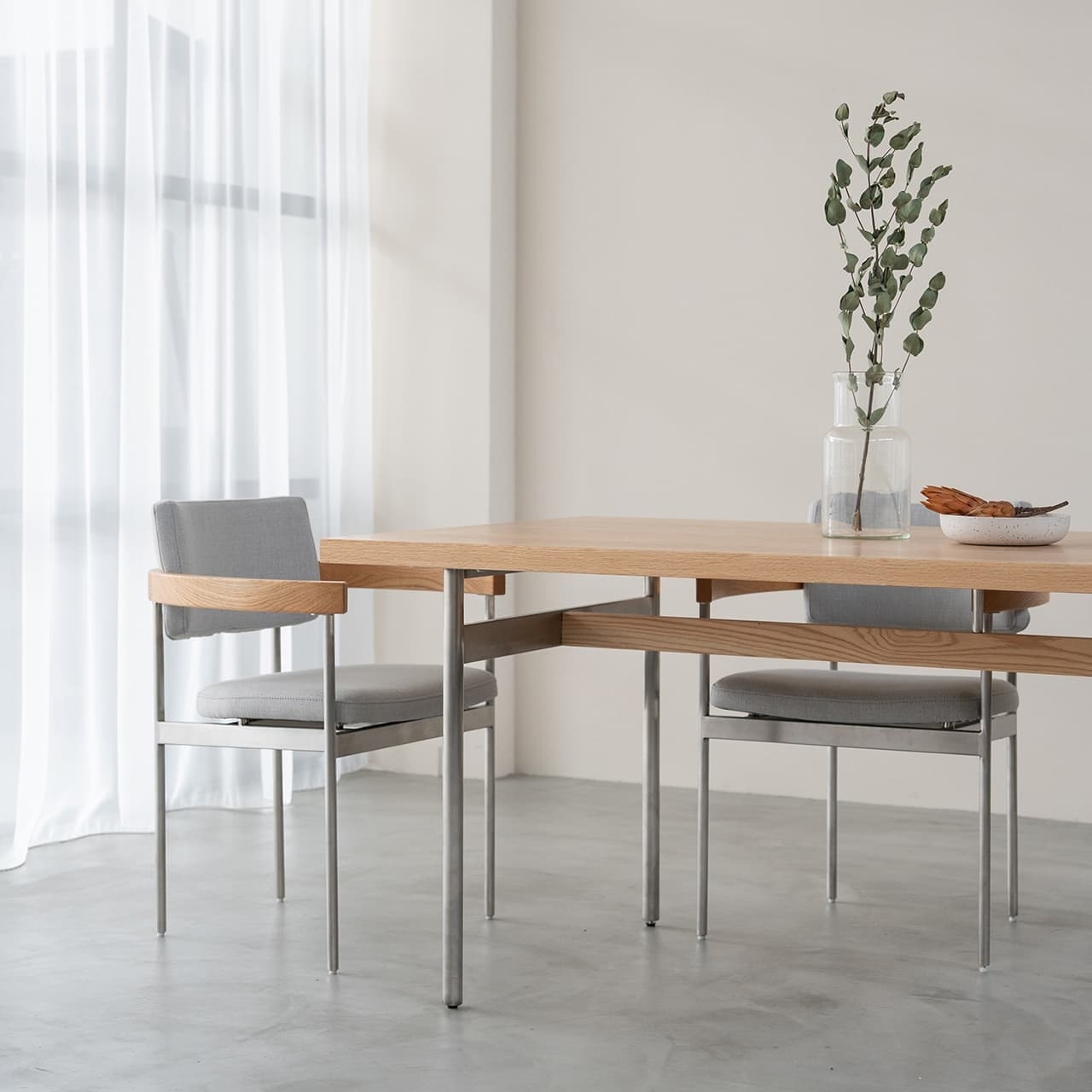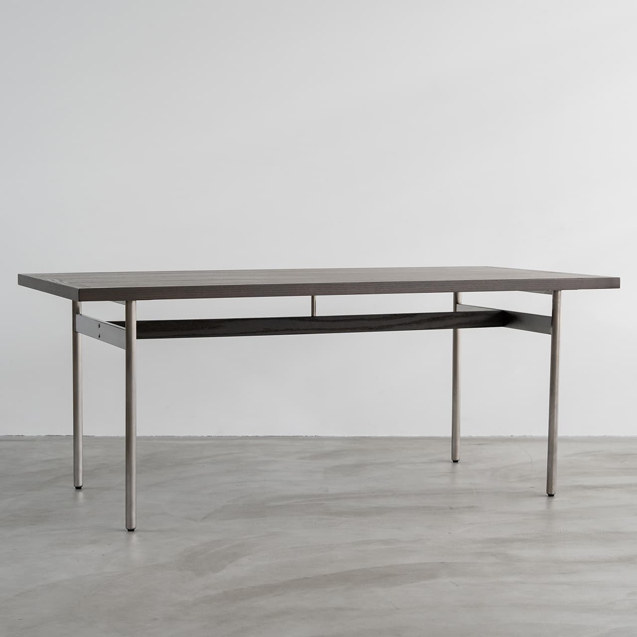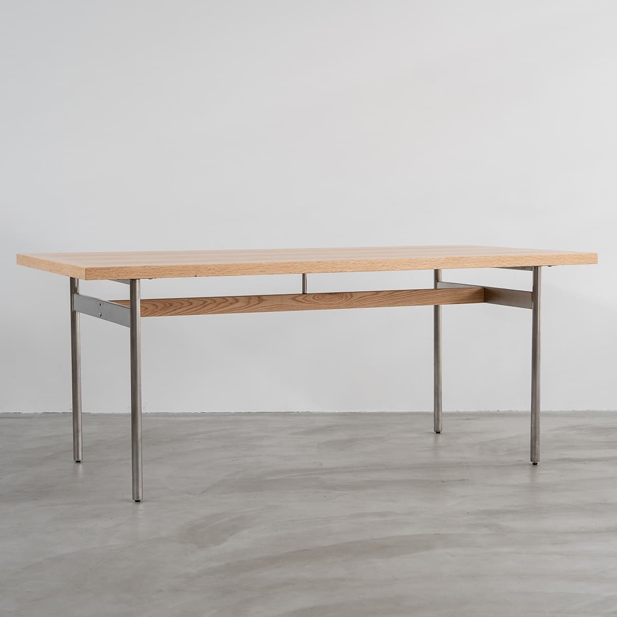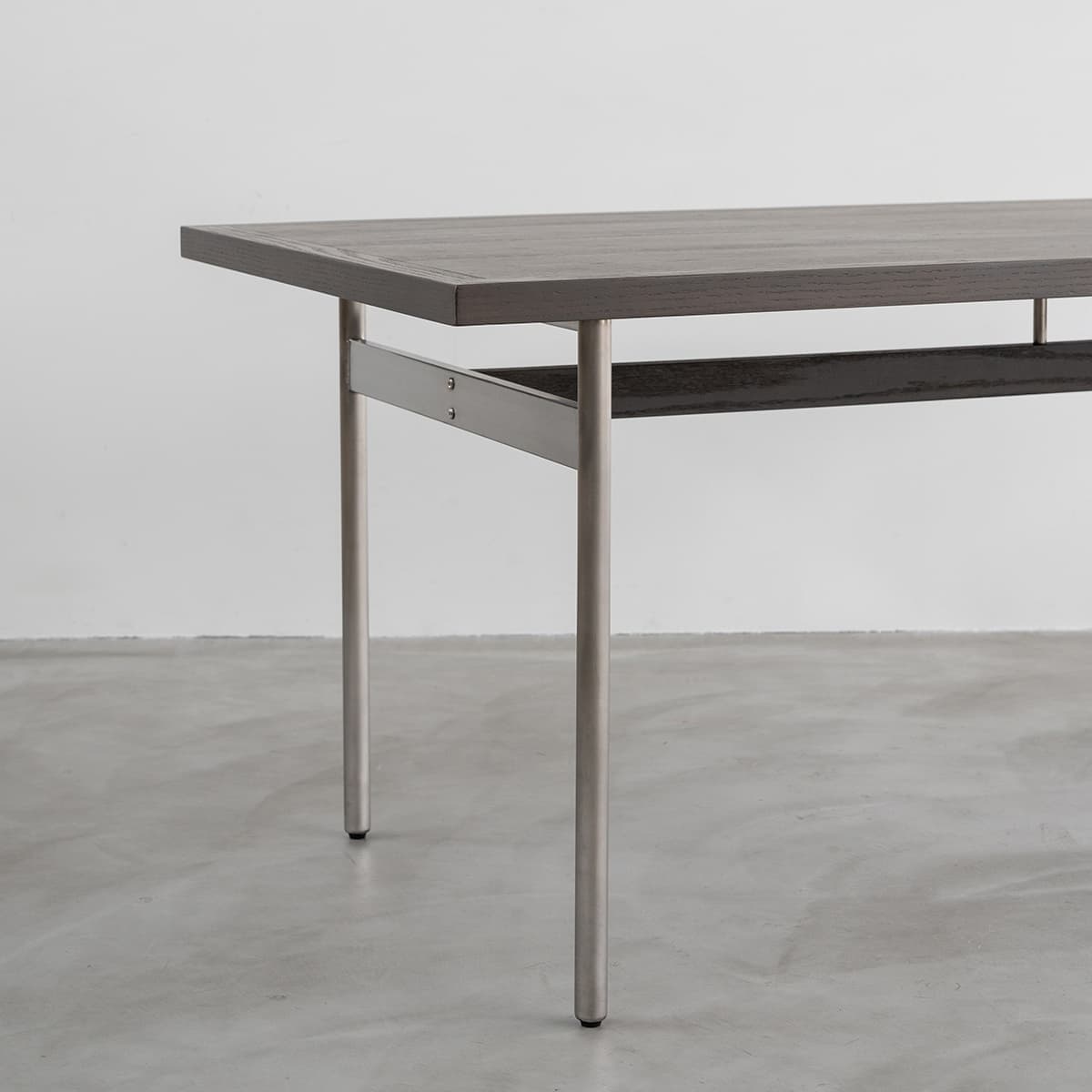 主張しないヘアライン加工されたステンレス脚とシャープですっきりとした木部の組み合わせが心地よいキストダイニングテーブル。