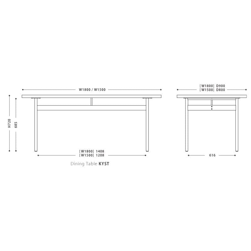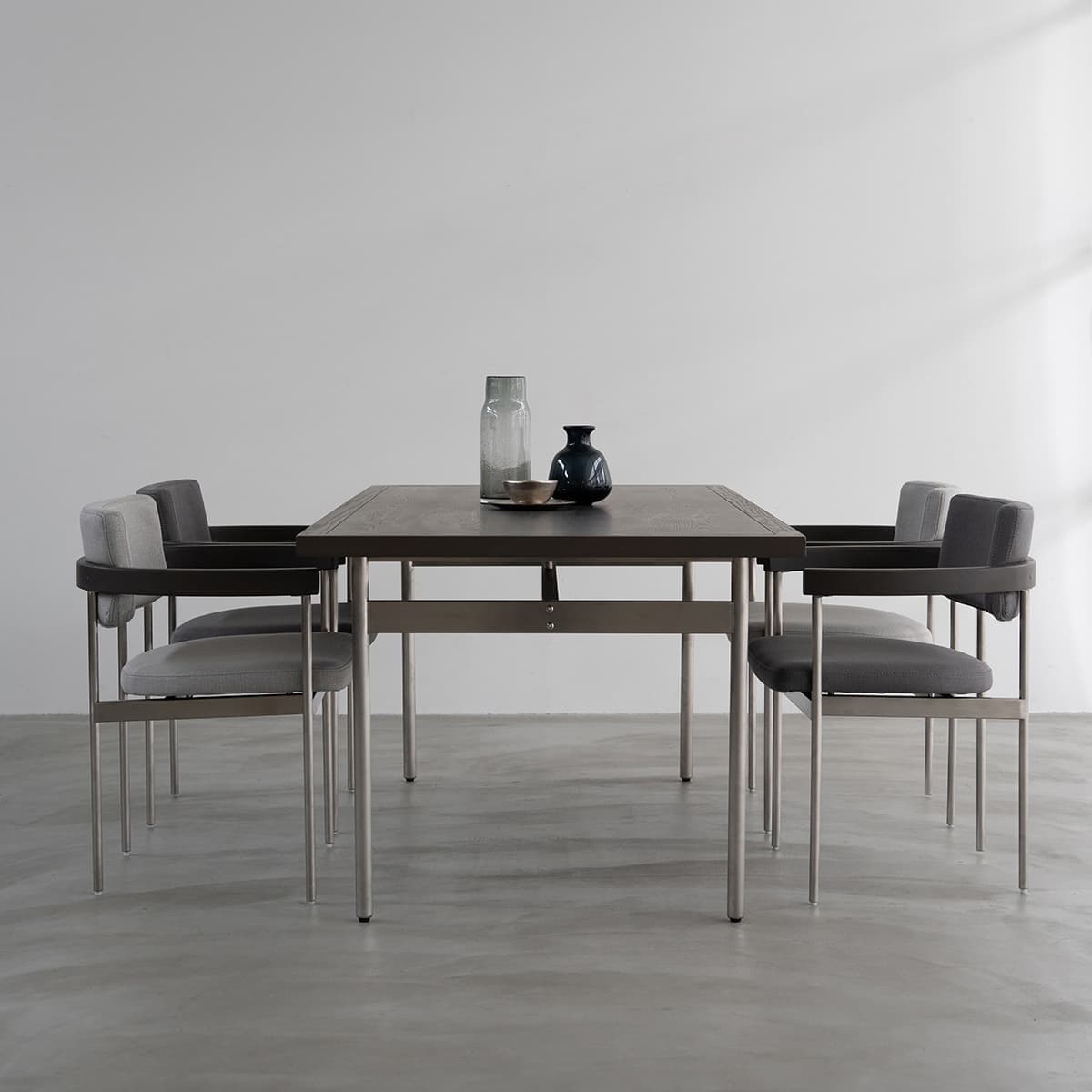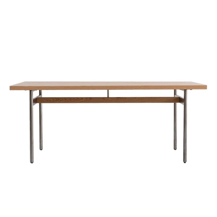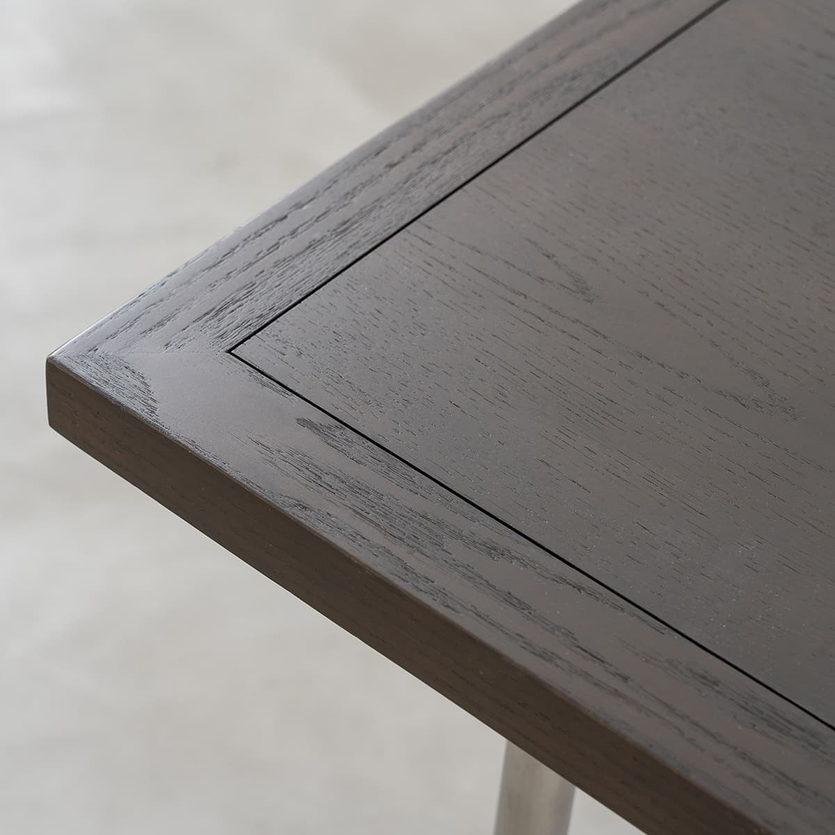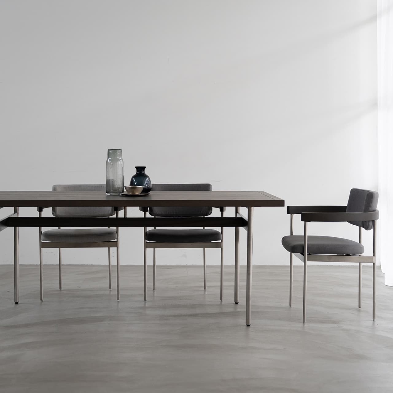 主張しないヘアライン加工されたステンレス脚とシャープですっきりとした木部の組み合わせが心地よいキストダイニングテーブル。